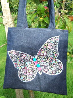 Denim fabric bag with bamboo/ cotton wadding and cotton fabric lining. Appliqued with cotton fabric butterfly motif.