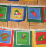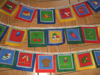 11 square cotton fabric images appliqued onto 11 coloured felt squares.