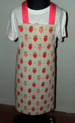 Linen look cotton fabric apron with strawberry print. Pink woven cotton neck and waist ties.