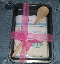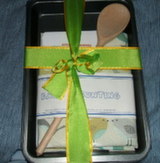 Gift set contains apron, recipe, wooden spoon in a loaf or cake tin.