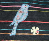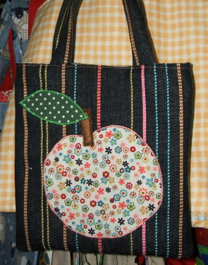 Denim fabric bag appliqued with cotton fabric or felt motif, with cotton fabric lining and cotton/ bamboo wadding.