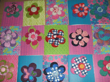felt flower shapes with buttons sewn on and a safe pin on back.