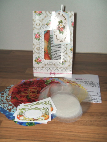 Fabric jar covers. Pack contains: 10 fabric jar covers, wax and cellophane discs, labels, elastic bands and recipes. Price: £5